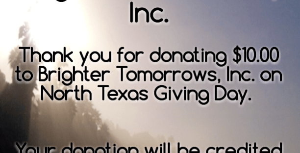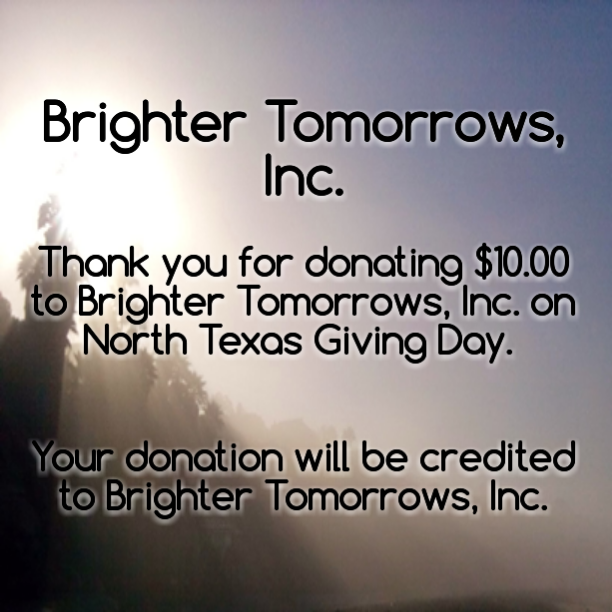 Thank you for donating $10.00 to Brighter Tomorrows, Inc. on North Texas Giving Day. Please print this page for your records. A receipt for tax purposes will also be emailed to the address you provided.