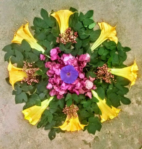 I’ve been on a roll making nature art this winter. I can’t walk anywhere without seeing potential. Mother nature’s palette is abundant, always transforming. Leafs change color, flowers bloom, rocks brighten with rain drops, branches fall. There is no lack in the material available. I was almost late to work the other day because I stopped at the park and began making a wreath with some beautiful, bushy, bright yellow flowers that had fallen off of a tree. Of course I had to arrange them. I couldn’t just walk on by. Luckily when I pulled out my phone to take a photo of my art, I saw the time and rushed off to work, arriving just a minute late. I hope you enjoy these pieces as much as I do.